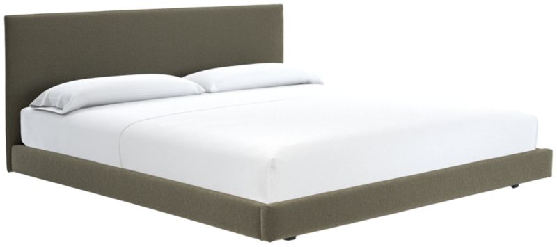 Clean box silhouette sleeps hi-fashion in soft white linen-y weave. Dreamy in hi/lo proportions: Slim cushioned headboard scales up for comfy reading in bed on low-profile frame. Tailored neat all the way around so it can float in the room. CB2 exclusive.