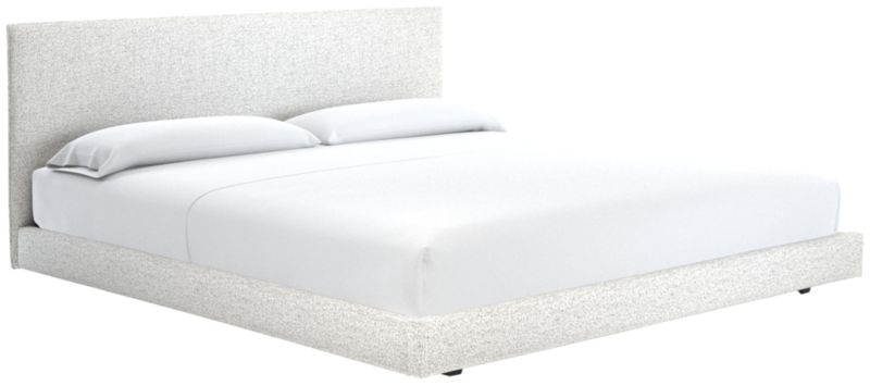 Clean box silhouette sleeps hi-fashion in soft white linen-y weave. Dreamy in hi/lo proportions: Slim cushioned headboard scales up for comfy reading in bed on low-profile frame. Tailored neat all the way around so it can float in the room. CB2 exclusive.