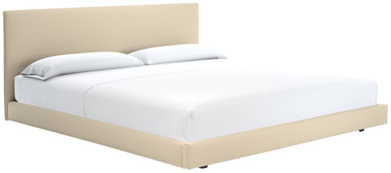 Clean box silhouette sleeps hi-fashion in soft white linen-y weave. Dreamy in hi/lo proportions: Slim cushioned headboard scales up for comfy reading in bed on low-profile frame. Tailored neat all the way around so it can float in the room. CB2 exclusive.