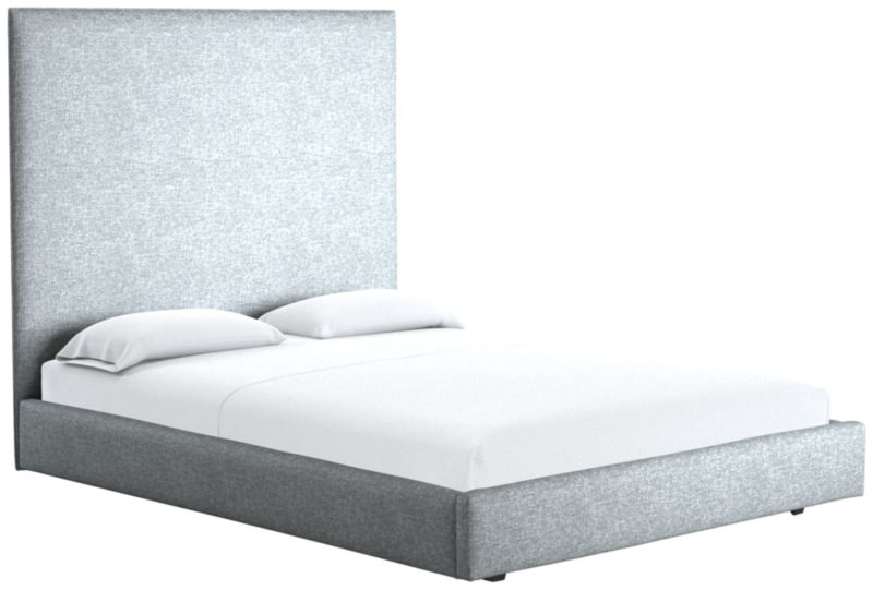 A study in proportion and restraint, bed pairs a clean box silhouette with exceptional materials. Solid maple wood frame supports a slim cushioned headboard scaled for comfort and dramatic height. The tailored design features a fully upholstered back, allowing it to float within a room. CB2 exclusive.