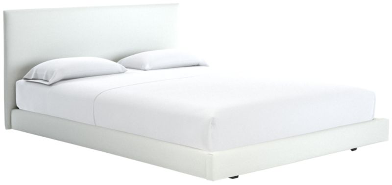 Clean box silhouette sleeps hi-fashion in soft white linen-y weave. Dreamy in hi/lo proportions: Slim cushioned headboard scales up for comfy reading in bed on low-profile frame. Tailored neat all the way around so it can float in the room. CB2 exclusive.