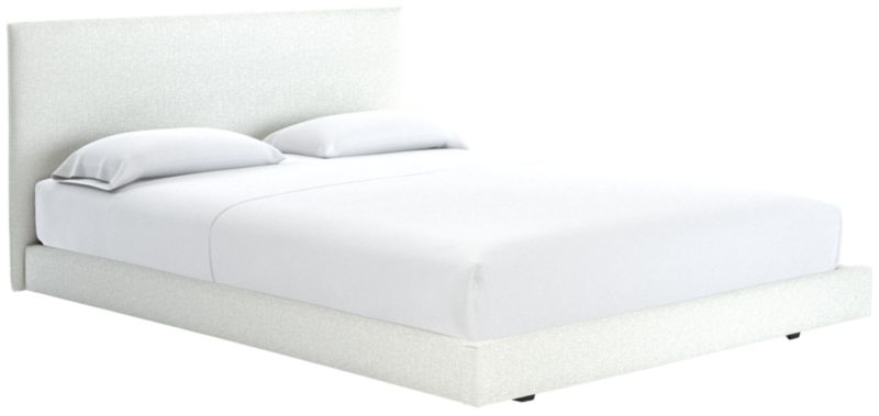 Clean box silhouette sleeps hi-fashion in soft white linen-y weave. Dreamy in hi/lo proportions: Slim cushioned headboard scales up for comfy reading in bed on low-profile frame. Tailored neat all the way around so it can float in the room. CB2 exclusive.
