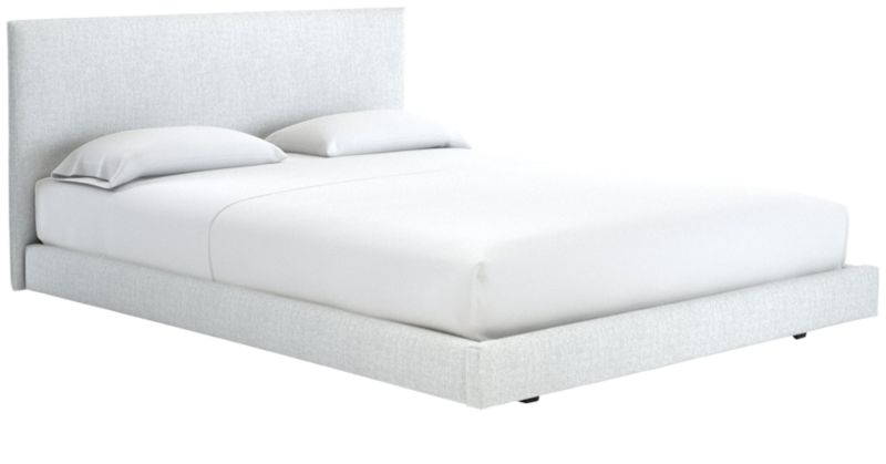 Clean box silhouette sleeps hi-fashion in soft white linen-y weave. Dreamy in hi/lo proportions: Slim cushioned headboard scales up for comfy reading in bed on low-profile frame. Tailored neat all the way around so it can float in the room. CB2 exclusive.