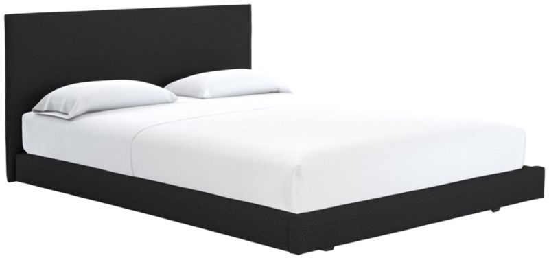 Clean box silhouette sleeps hi-fashion in soft white linen-y weave. Dreamy in hi/lo proportions: Slim cushioned headboard scales up for comfy reading in bed on low-profile frame. Tailored neat all the way around so it can float in the room. CB2 exclusive.