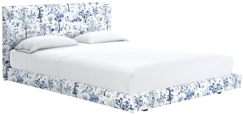 Clean box silhouette sleeps hi-fashion in soft white linen-y weave. Dreamy in hi/lo proportions: Slim cushioned headboard scales up for comfy reading in bed on low-profile frame. Tailored neat all the way around so it can float in the room. CB2 exclusive.