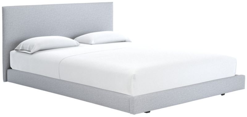 Clean box silhouette sleeps hi-fashion in soft white linen-y weave. Dreamy in hi/lo proportions: Slim cushioned headboard scales up for comfy reading in bed on low-profile frame. Tailored neat all the way around so it can float in the room. CB2 exclusive.