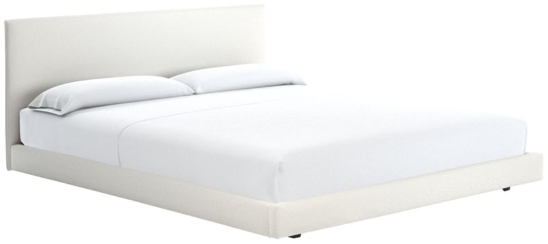 Clean box silhouette sleeps hi-fashion in soft white linen-y weave. Dreamy in hi/lo proportions: Slim cushioned headboard scales up for comfy reading in bed on low-profile frame. Tailored neat all the way around so it can float in the room. CB2 exclusive.