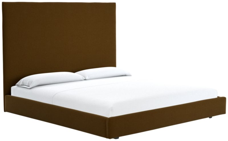 A study in proportion and restraint, bed pairs a clean box silhouette with exceptional materials. Solid maple wood frame supports a slim cushioned headboard scaled for comfort and dramatic height. The tailored design features a fully upholstered back, allowing it to float within a room. CB2 exclusive.