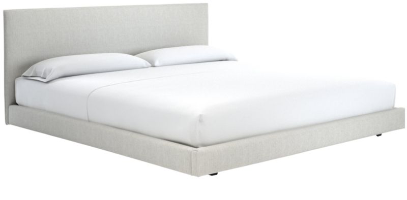 Clean box silhouette sleeps hi-fashion in soft white linen-y weave. Dreamy in hi/lo proportions: Slim cushioned headboard scales up for comfy reading in bed on low-profile frame. Tailored neat all the way around so it can float in the room. CB2 exclusive.