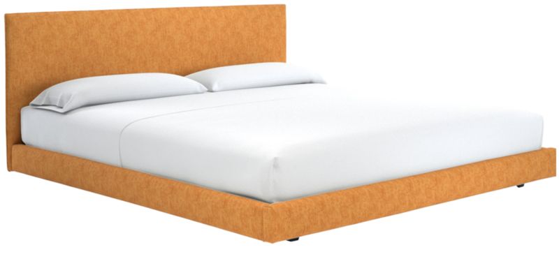 Clean box silhouette sleeps hi-fashion in soft white linen-y weave. Dreamy in hi/lo proportions: Slim cushioned headboard scales up for comfy reading in bed on low-profile frame. Tailored neat all the way around so it can float in the room. CB2 exclusive.
