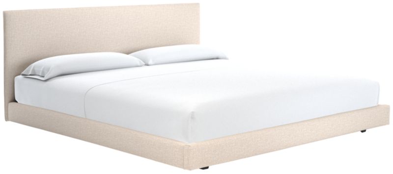 Clean box silhouette sleeps hi-fashion in soft white linen-y weave. Dreamy in hi/lo proportions: Slim cushioned headboard scales up for comfy reading in bed on low-profile frame. Tailored neat all the way around so it can float in the room. CB2 exclusive.