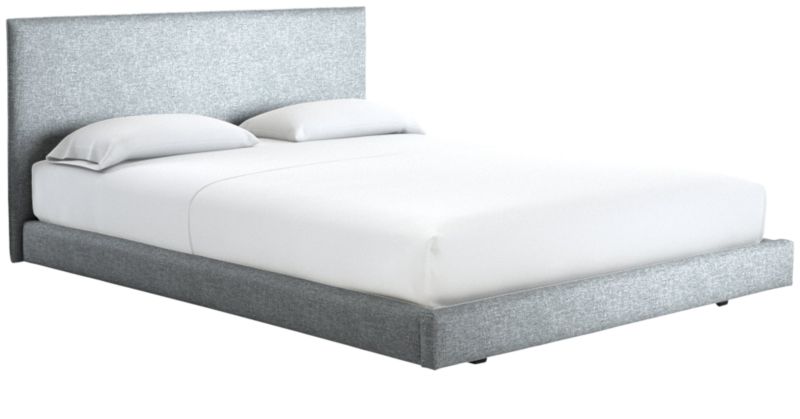 Clean box silhouette sleeps hi-fashion in soft white linen-y weave. Dreamy in hi/lo proportions: Slim cushioned headboard scales up for comfy reading in bed on low-profile frame. Tailored neat all the way around so it can float in the room. CB2 exclusive.