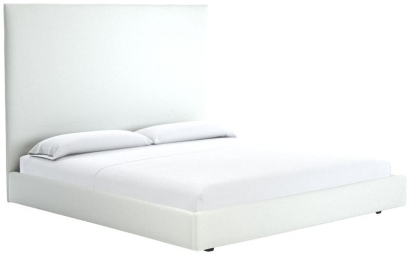 A study in proportion and restraint, bed pairs a clean box silhouette with exceptional materials. Solid maple wood frame supports a slim cushioned headboard scaled for comfort and dramatic height. The tailored design features a fully upholstered back, allowing it to float within a room. CB2 exclusive.