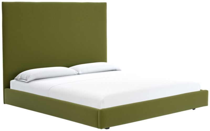 A study in proportion and restraint, bed pairs a clean box silhouette with exceptional materials. Solid maple wood frame supports a slim cushioned headboard scaled for comfort and dramatic height. The tailored design features a fully upholstered back, allowing it to float within a room. CB2 exclusive.