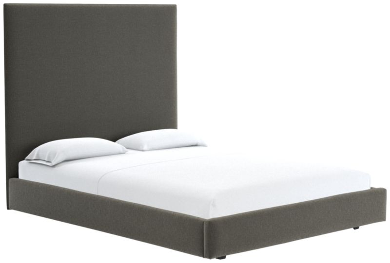 A study in proportion and restraint, bed pairs a clean box silhouette with exceptional materials. Solid maple wood frame supports a slim cushioned headboard scaled for comfort and dramatic height. The tailored design features a fully upholstered back, allowing it to float within a room. CB2 exclusive.