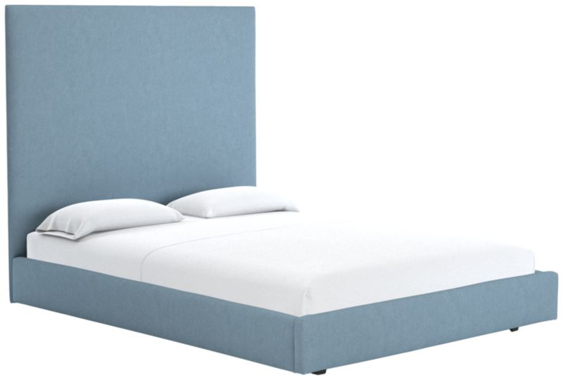 A study in proportion and restraint, bed pairs a clean box silhouette with exceptional materials. Solid maple wood frame supports a slim cushioned headboard scaled for comfort and dramatic height. The tailored design features a fully upholstered back, allowing it to float within a room. CB2 exclusive.