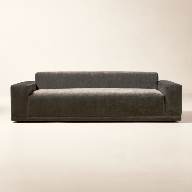 Deep, generously proportioned sofa designed by Melbourne-based VUUE is sophisticated in a warm grey performance velvet. The oversized profile is perfect for lounging with family and friends without sacrificing style. Performance velvet withstands spills and other stressors, yet retains the lushness of a high-end textile. CB2 exclusive.