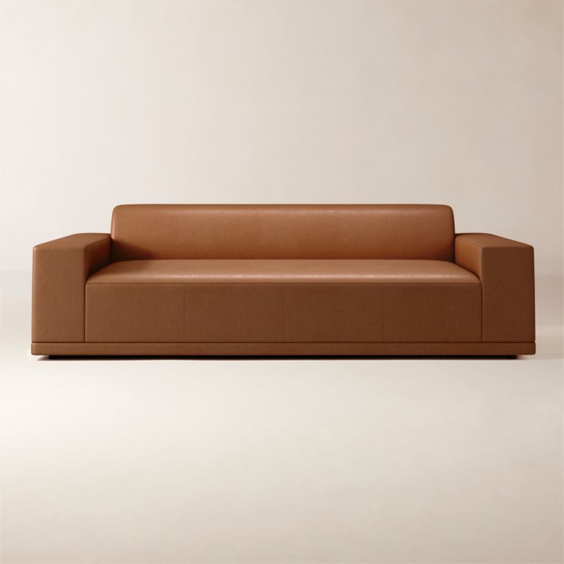 Deep, generously proportioned sofa designed by VUUE is sophisticated in Moore & Giles full-grain leather upholstery. The oversized profile is perfect for lounging with family and friends without sacrificing style. Hand-selected for its inherent markings and characteristics, the leather upholstery is finished with layers of wax for a naturally worn-in aesthetic. CB2 exclusive.