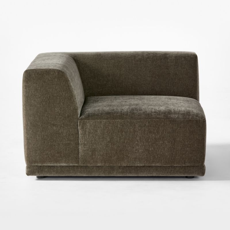 Deep, generously proportioned corner chair Designed by VUUE, is sophisticated in warm grey performance velvet. The oversized profile is perfect for lounging with family and friends without sacrificing style. Performance fabric withstands spills and other stressors, yet retains the lushness of a high-end textile. Add coordinating Faible pieces to create a spacious sectional sofa. CB2 exclusive.