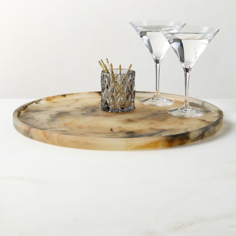 Faux horn round tray exudes the elegance of a French Art Deco design. Skilled artisans pour resin into a mold with a matte horn finish applied by hand for a distinctive look. Tonal variations in the finish range from warm grey to caramel and chocolate brown, making each tray unique. CB2 exclusive.
