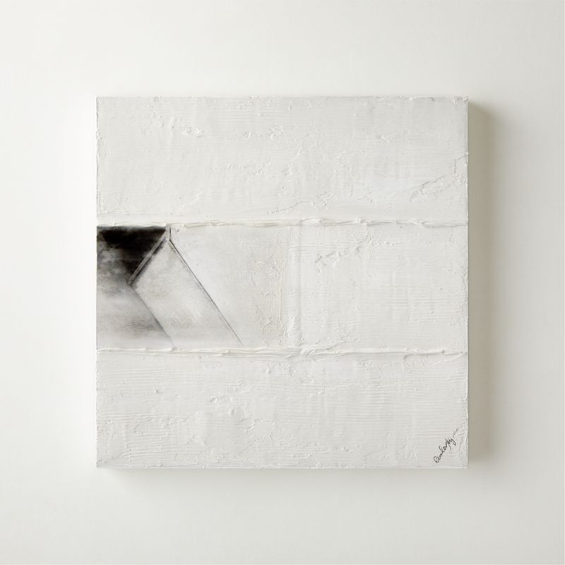 Amber Fey references concrete structures in her "Fibonacci" series using a meditative mix of materials. "I was inspired by architecture and the uncovering of old elements while refurbishing an old building," she explains. The original work was created by slowly pulling concrete across the canvas to frame a single black-and-white photograph. As the concrete cures, unique markings are revealed for a highly textured surface. Reproduced here to emulate the artist's original techniques. Hangs in two orientations.