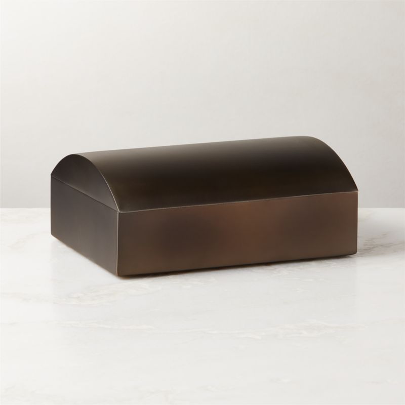 Handcrafted of stainless steel, storage box is characterized by a rich blackened brass finish. The simple form features a curved lid for a seamless look that's beautiful on a bookshelf or desktop. CB2 exclusive.
