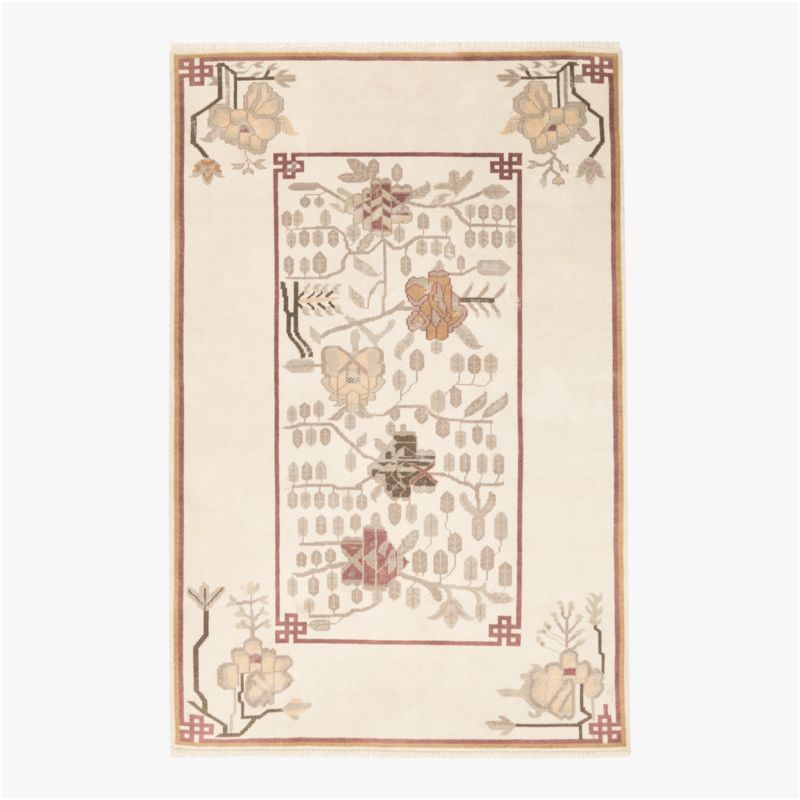 Designed by Kara Mann, low-pile area rug honors the craftsmanship of vintage Chinese Peking and Art Deco rugs, reimagined with contemporary elegance. At its center, a classic medallion is surrounded by intricate floral motifs, while geometric borders and stylized corner elements refine its aesthetic with a balance of tradition and modernity. Hand-knotted from a luxurious blend of New Zealand and European wool, the rug achieves its varying pile levels as artisans shear the wool by hand. A final process of distressing and washing creates the timeworn, vintage character. CB2 exclusive.