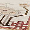 Kara Mann, low-pile area rug honors the craftsmanship of vintage Chinese Peking and Art Deco rugs, reimagined with contemporary elegance. At its center, a classic medallion is surrounded by intricate floral motifs, while geometric borders and stylized corner elements refine its aesthetic with a balance of tradition and modernity. Hand-knotted from a luxurious blend of New Zealand and European wool, the rug achieves its varying pile levels as artisans shear the wool by hand. A final process of distressing and washing creates the timeworn, vintage character. CB2 exclusive.