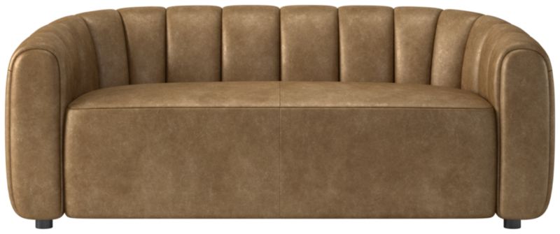 Upholstered sofa by Melbourne-based design studio VUUE evokes the elegance of an art deco piece. With its lush leather upholstery, the sofa features deep channel tufting that softens the rounded profile. CB2 exclusive.