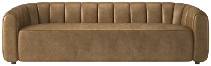 Upholstered sofa by Melbourne-based design studio VUUE evokes the elegance of an art deco piece. With its lush leather upholstery, the sofa features deep channel tufting that softens the rounded profile. CB2 exclusive.