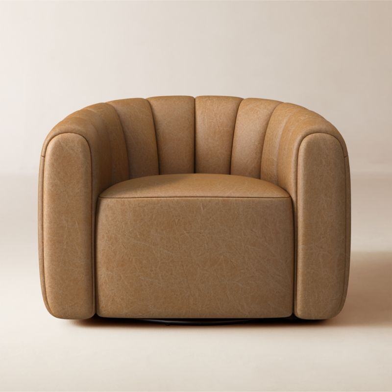 Upholstered swivel chair by Melbourne-based design studio VUUE evokes the elegance of an art deco piece. With its lush leather upholstery, the chair features deep channel tufting that softens the rounded profile. CB2 exclusive.
