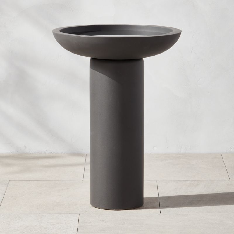 Designed by Studio Anansi, sculptural charcoal bird bath makes a modern statement in the garden or patio area. Crafted from a mix of sand and stone composite, weather-resistant bird bath has a smooth cylindrical base that supports a curved pool. It's a structure made to entice winged visitors while delighting their admirers. CB2 exclusive.