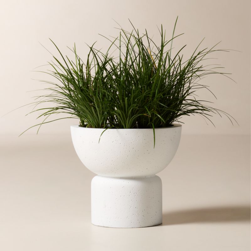 Sculptural planter by Studio ANANSI makes a modern statement indoors or out. Crafted from a mix of sand and stone composite, planter is molded into a unique platform base with a wide opening. Perfect for a lush display. Bright white finish is weather-resistant. Comes in a range of sizes and colors—perfect for leveling and layering. CB2 exclusive.