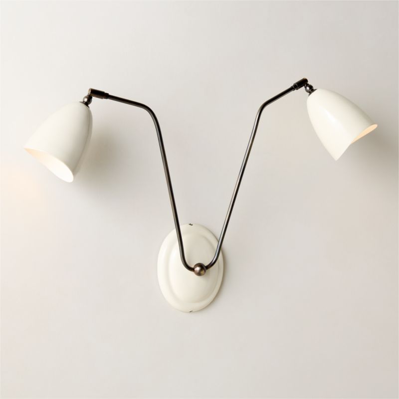 Designed to be as functional as it is expressive, elegant enamel articulating sconce by Melbourne-based design studio VUUE takes its inspiration from the interplay of clean, modern elements with organic touches. Crafted from brass with two sleek dark bronze arms, the sconce features articulating shades that cast a warm, focused light. CB2 exclusive.