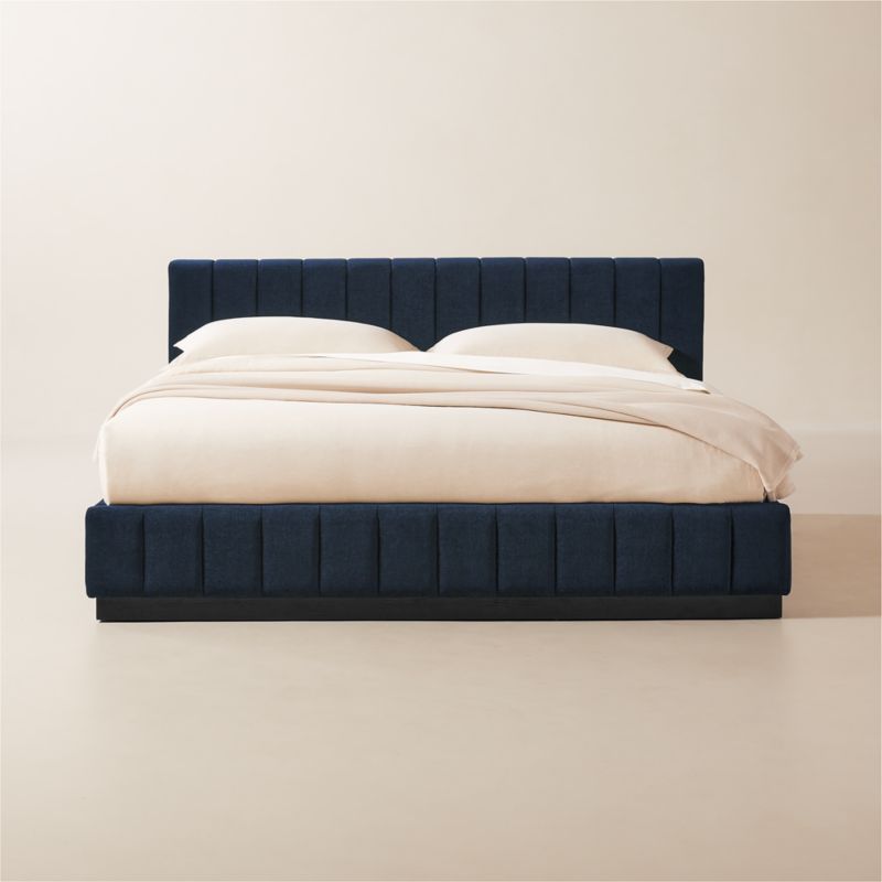 Designed by Mermelada Estudio, cushy channels of plush upholstery line the length of this finely tailored bed. Plinth oak wood base with a black finish keeps a minimal profile. A true statement piece. CB2 exclusive.