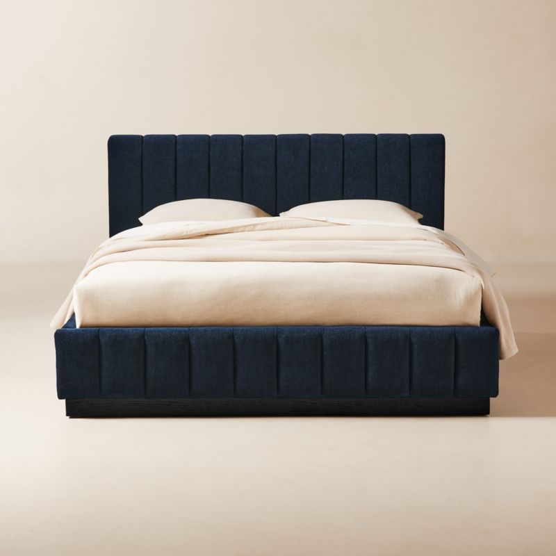 Designed by Mermelada Estudio, cushy channels of plush upholstery line the length of this finely tailored bed. Plinth oak wood base with a black finish keeps a minimal profile. A true statement piece. CB2 exclusive.