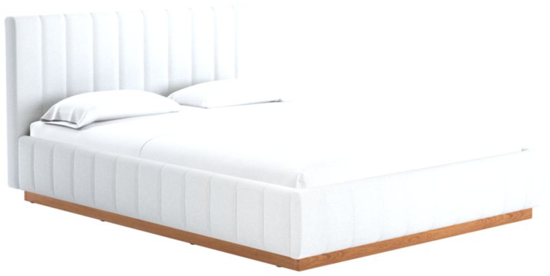 Designed by Mermelada Estudio, cushy channels of lush upholstery line the length of this finely tailored bed. Plinth oak wood base keeps a minimal profile finished in a subtle whitewash. A true statement piece. Learn about Mermelada Estudio on our blog. CB2 exclusive.