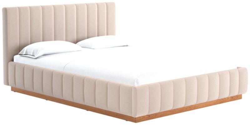 Designed by Mermelada Estudio, cushy channels of lush upholstery line the length of this finely tailored bed. Plinth oak wood base keeps a minimal profile finished in a subtle whitewash. A true statement piece. Learn about Mermelada Estudio on our blog. CB2 exclusive.
