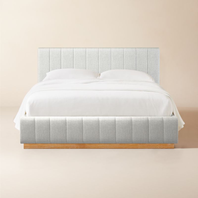 Designed by Mermelada Estudio, cushy channels of lush upholstery line the length of this finely tailored bed. Plinth oak wood base keeps a minimal profile finished in a subtle whitewash. A true statement piece. Learn about Mermelada Estudio on our blog. CB2 exclusive.