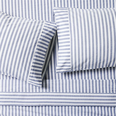 See in-stock & shipping info on Crate Loading...Crate & BarrelSKU 584216Oxford Shirting Light Indigo Blue Organic Cotton Queen Bed Sheet Set$179.950 of 1 purchasedBuy on Crate
