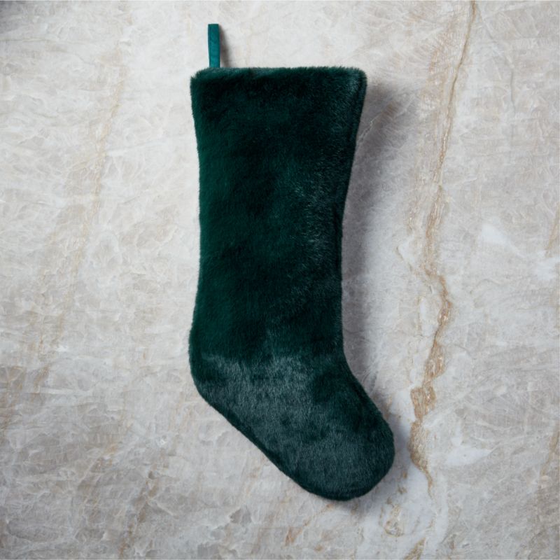 Faux fur stocking in a rich shade of emerald hangs from a single loop, adding luscious materiality to the mantel or stair rail. Pair with the Harlee Green Faux Fur Tree Skirt. CB2 exclusive.