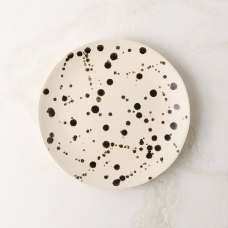 Hand-glazed in Portugal, stoneware salad plate is inspired by abstract drip paintings. Skilled Portuguese artisans press each piece into a mold before coating the durable stoneware in a matte ivory reactive glaze. Then, they apply a dark glaze, creating drips that are unique to each piece. CB2 exclusive.