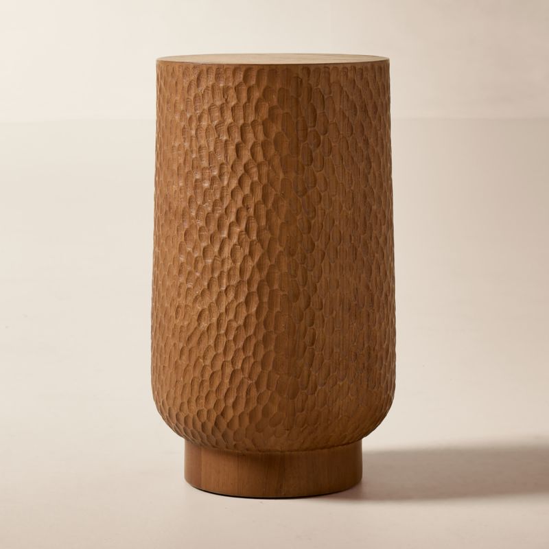 Modern round drink table by Los Angeles-based AD100 designer Ross Cassidy is characterized by a stunning hand-chiseled design. Each piece is crafted of FSC ®-certified oak with sides that have been carved by highly skilled artisans in a time-consuming process that creates distinctive texture. CB2 exclusive.