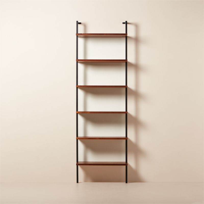 Fresh feels for a cult favorite. Six shelves in rich walnut veneer are fixed to powdercoated metal frames and stand stacked to heights of 96". Modularly designed to save space and repeat dramatically down the wall, with a vibe that plays nicely alongside our Helix walnut desk. Stud mounting recommended; hardware included for drywall installation. CB2 exclusive.