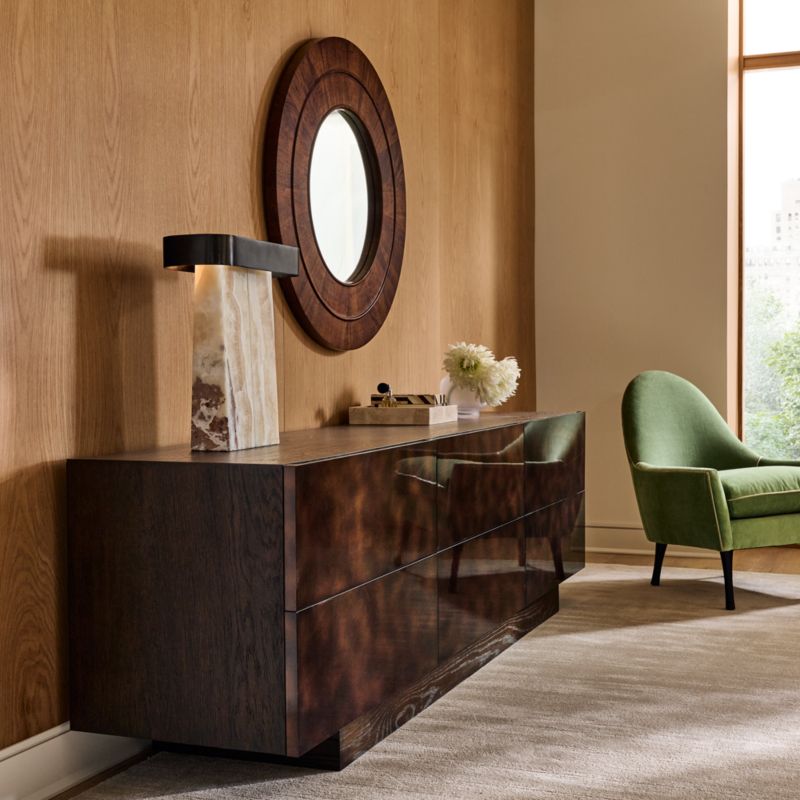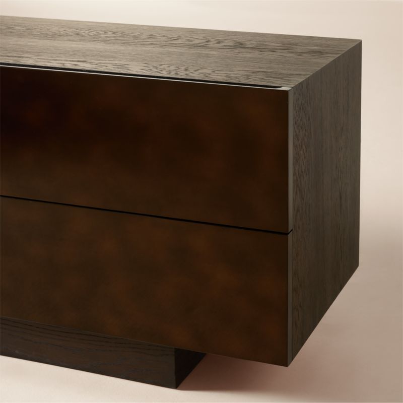 FSC ®-certified mahogany nightstand by NYC-based designer David Aguirre is scaled for a bold presence. Drawing the eye in with a high-gloss finish, two drawer fronts are painted by hand in multiple layers to create a subtle dappled effect. For a seamless look, pair with the matching Hudson dresser. CB2 exclusive.