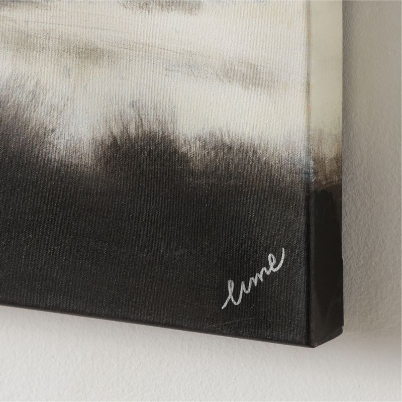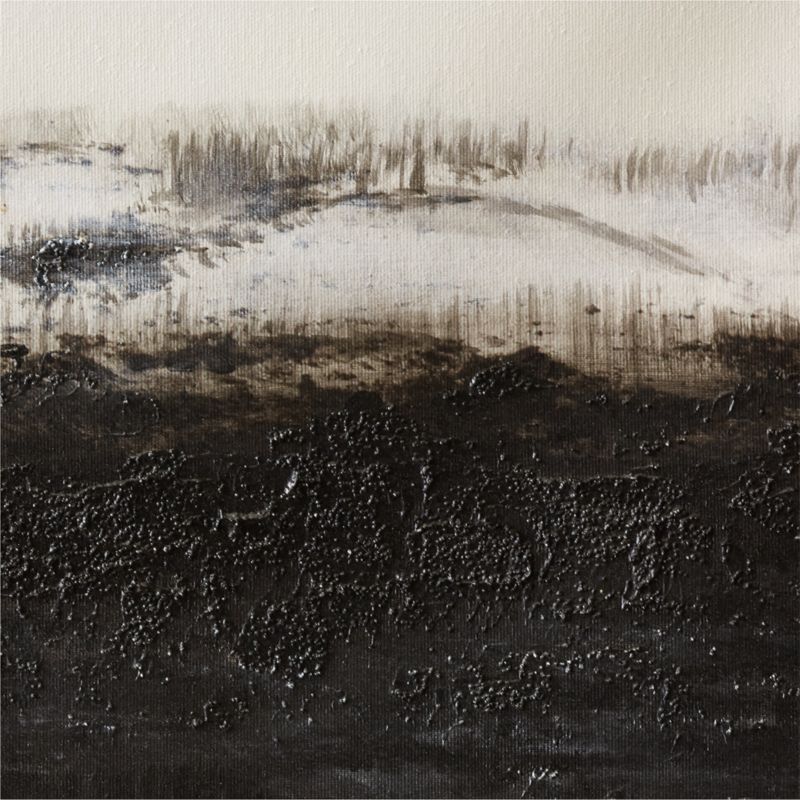 Created to reflect the simple, natural movements in water, light and fog, "Ikigai III" is part of a series characterized by a sense of meditative harmony. "My inspiration for this painting was to create peace through personal reflection. The Japanese concept 'Ikigai' refers to the personal satisfaction that comes from finding meaning and purpose," explains artist Lune. Created using rough black sand texture and black paint to organically combine and create a hazy atmospheric quality. Reproduced here using the artist's original techniques. Hangs in two orientations.
