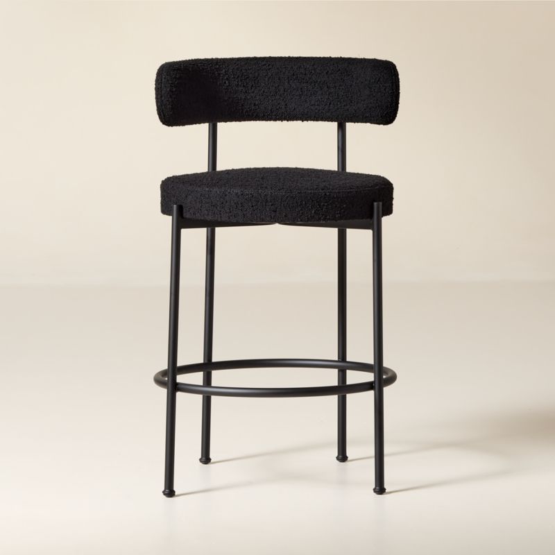 Made in Italy, black boucle counter stool by Omar De Biaggio catches the eye with its casual good looks. Steel tube frame is finished with a matte black powdercoat to contrast with the textured black boucle seat and curved back. CB2 exclusive.