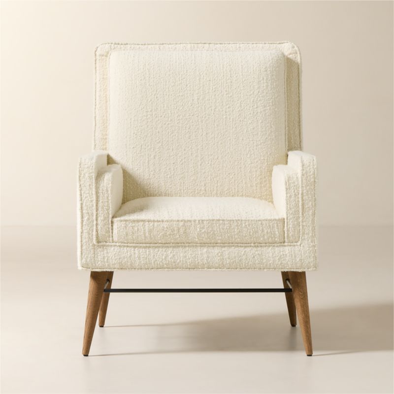 Paul McCobb's groundbreaking Irwin collection, the Model 5012 chair is a quintessential icon of midcentury design. Long sought after by collectors, the original chair is reintroduced with luxurious Italian boucle upholstery and the classic warmth of solid oak legs. Welt detailing and a stacked cushion look on arms reveal the chair's high level of European craftsmanship, which echoes McCobb's mastery of form and function. CB2 exclusive.