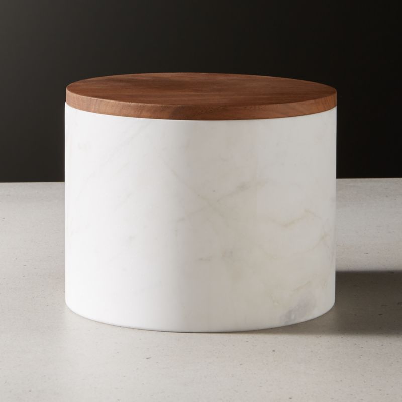Upgrade your storage style with Ross Cassidy's refined take on humble kitchen canisters. Handcrafted from marble, oversized/low silhouette is topped with a warm acacia wood lid that gracefully conceals whatever's inside. ishi marble canisters is a CB2 exclusive.