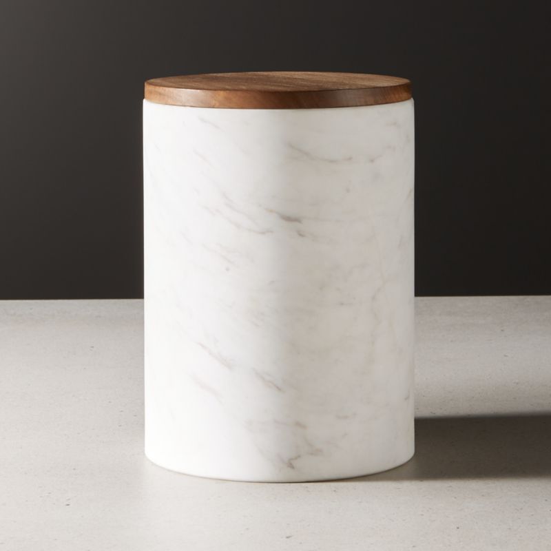 Upgrade your storage style with Ross Cassidy's refined take on humble kitchen canisters. Handcrafted from marble, oversized/low silhouette is topped with a warm acacia wood lid that gracefully conceals whatever's inside. ishi marble canisters is a CB2 exclusive.